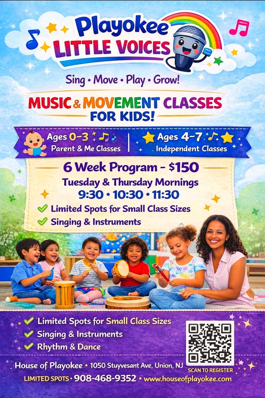 Ages 0–3: Parent & Me bonding experience Ages 4–7: Independent, confidence-building classes Small class sizes for personalized attention Singing, instruments, rhythm & dance Morning sessions every Tuesday & Thursday