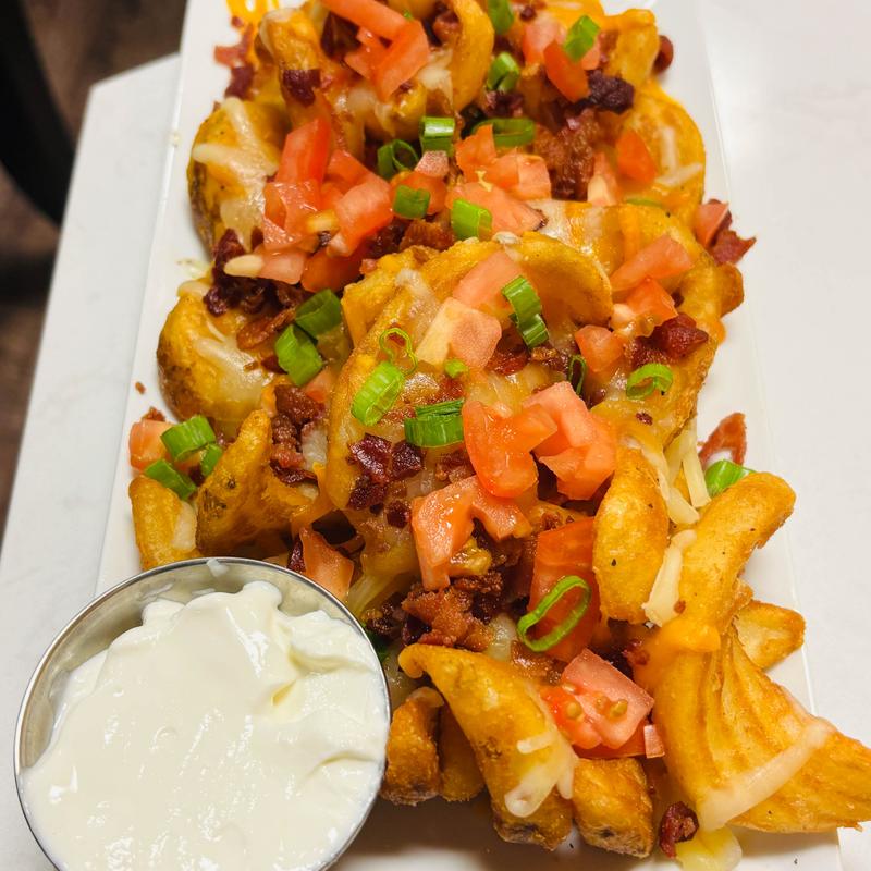 French fries with shredded cheese, bacon, scallions, tomatoes, and sour cream...... $12.00