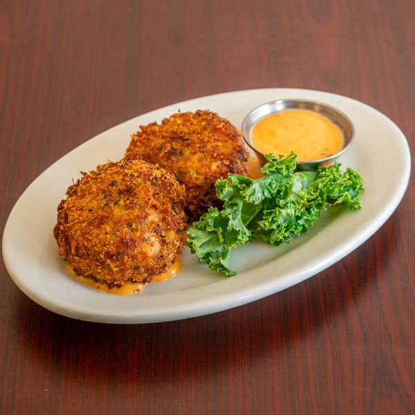 Two Maryland style crab cakes, fresh spices, and herbs with creamy garlic sauce